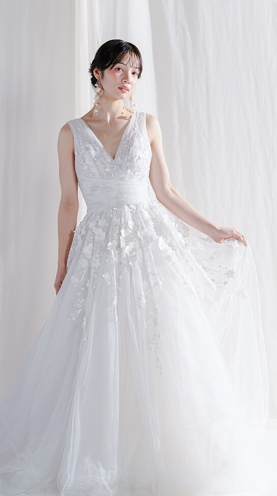 世界中の花嫁を魅了するANTONIO RIVAや韓国ブランドなどインポートドレスは、買い付けの際に日本人が着ても馴染むようシルエットを修正。国内人気が高いKIKOYO HATAやJILLSTUARTなどはこだわりのセレクトで。花嫁目線でさらに素敵になるよう、生地やデザインを変更してもらうことも。1着1着を大切に考えてラインナップしています。ドレスに合うアクセサリーも揃うので、トータルで花嫁コーディネートをお楽しみいただけます。