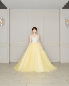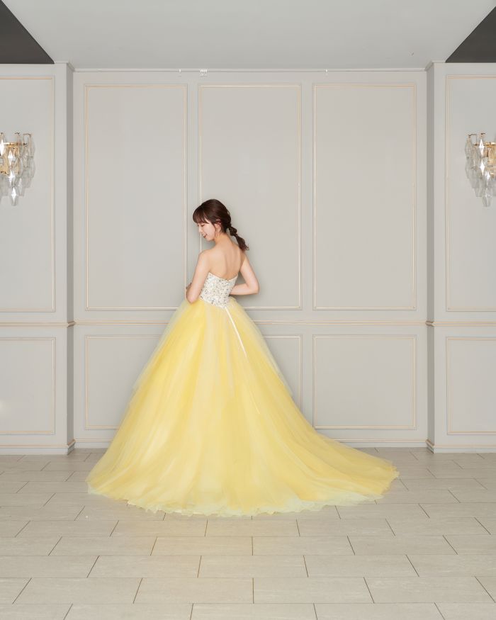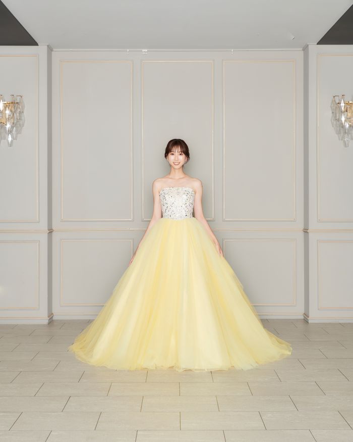 クリアなイエローと胸元のオーロラビジュの組み合わせはアイドル感をプラス💛 スカートにもグリッターが施された360°キュートなドレスです⋆