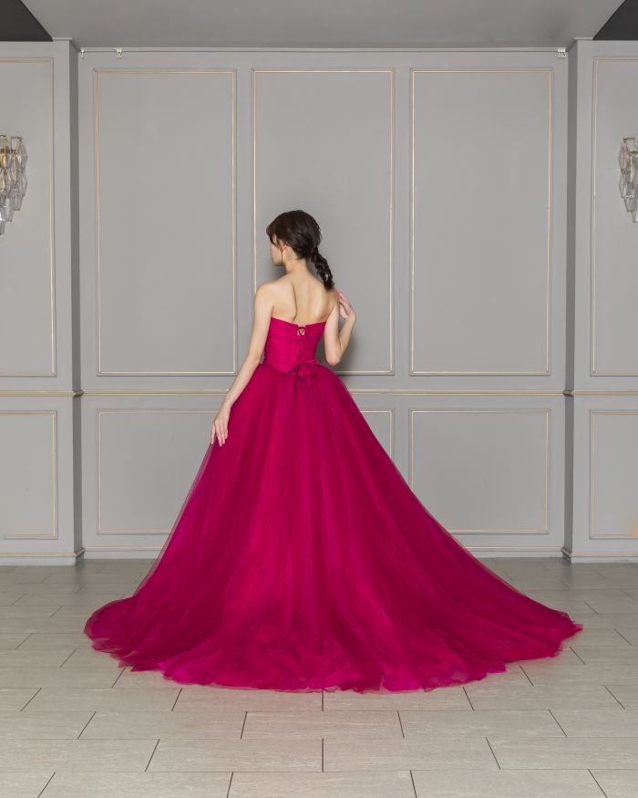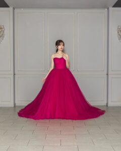 ピンクの混じったレッドカラーは王道なお色直しカラー☺ 存在感のあるプリンセスラインとシンプルなデザインの相性がバッチリ◎