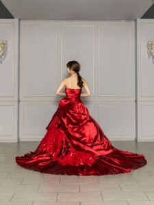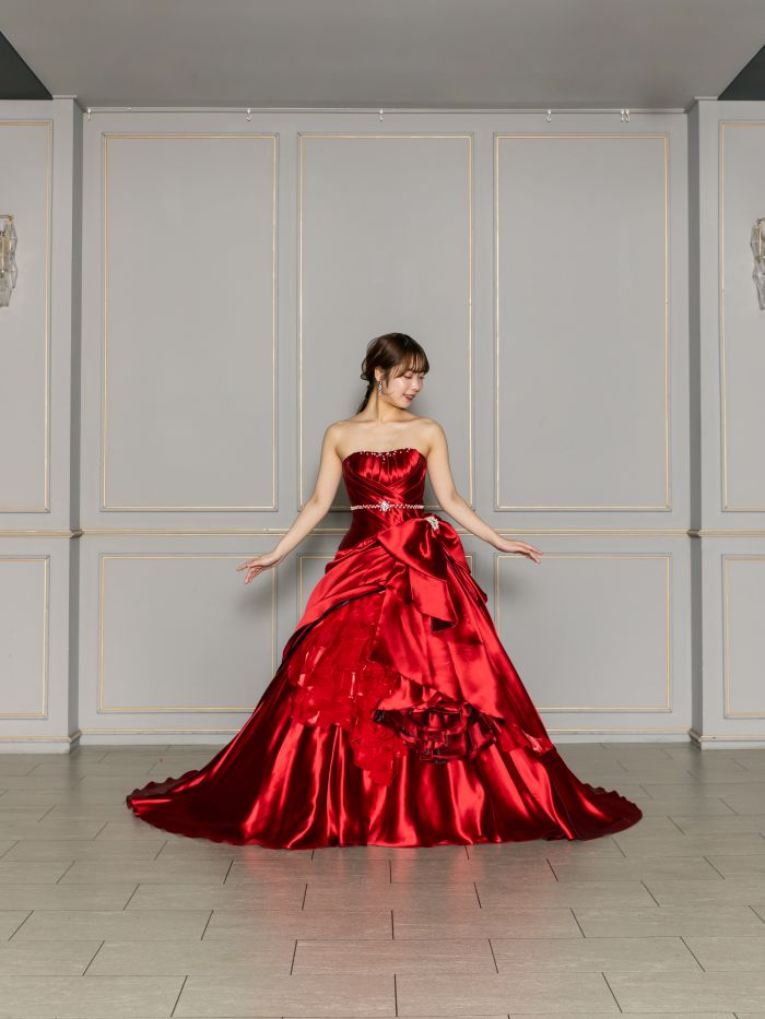 リボンやパールをあしらったゴージャスなデザインと深紅の組み合わせは、プリンセスそのもの👑 まるで薔薇のようなスタイルは歩く姿からも気品が溢れます🌹