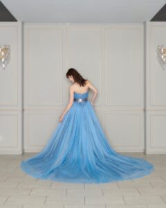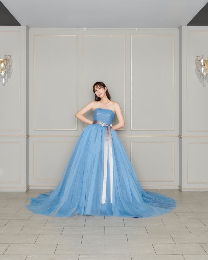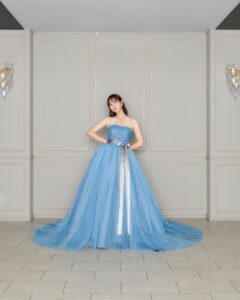 清楚で優しい印象を与えてくれるブルーカラーに幾重にも重なるチュールスカートで可愛らしさを追加。花嫁様の透明感を最大限に引き出す1着です。