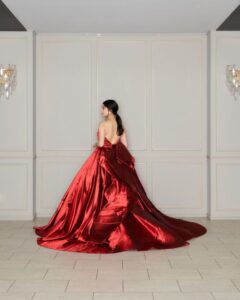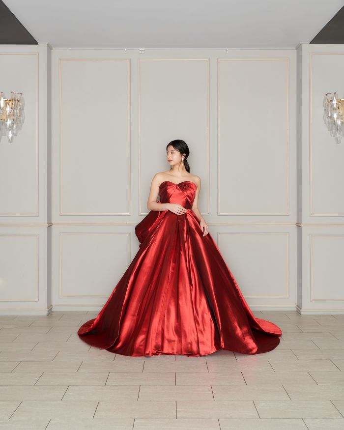 上品で大胆なレッドのカラードレス。美しい艶のあるサテン地でワンランク上の装いを🌹バックスタイルにもこだわった一着。
