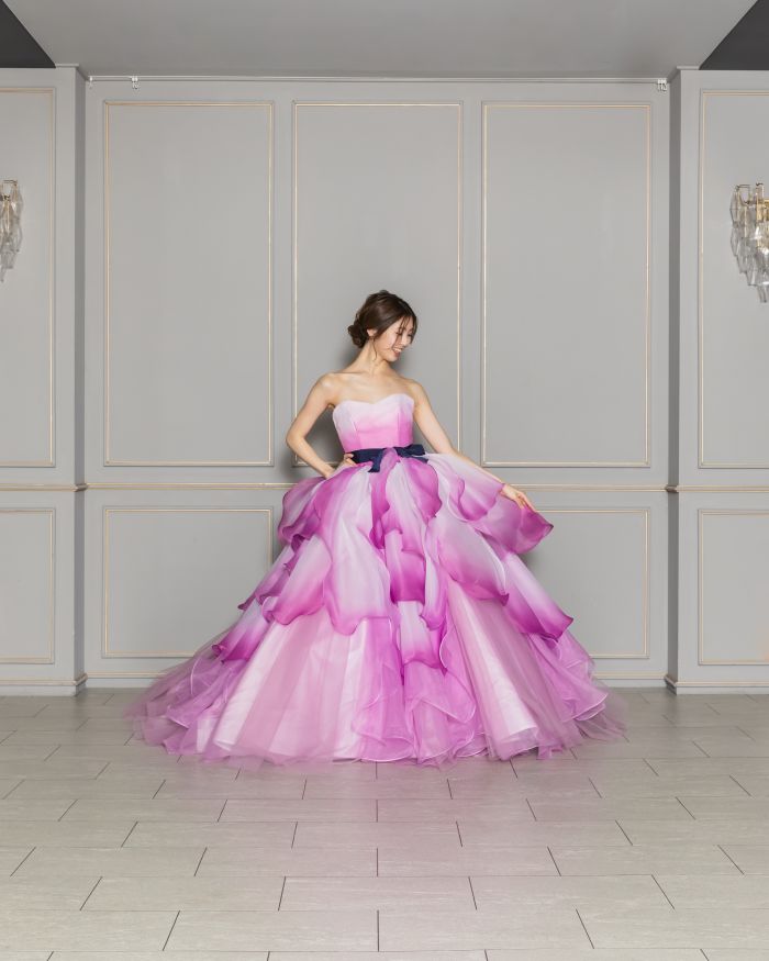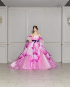 花がそのままドレスになったかのようなデザインが可愛い1着。サッシュリボンのネイビーがアクセントとなって全体をぐっと引き締めます🌸