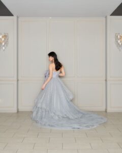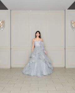 ウエスト部分の縦リボンは可愛らしくなり過ぎず、個性派で大人な印象に。チュール内部にはシルバー刺繍が施されており品のある1着です!