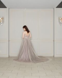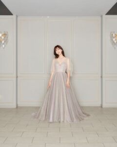 洗練された大人っぽく上品な雰囲気のドレス。胸元はVカットと深めのデザインで大人な女性を演出してくれます。