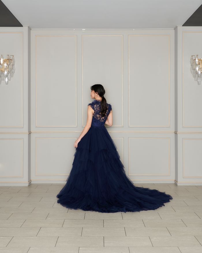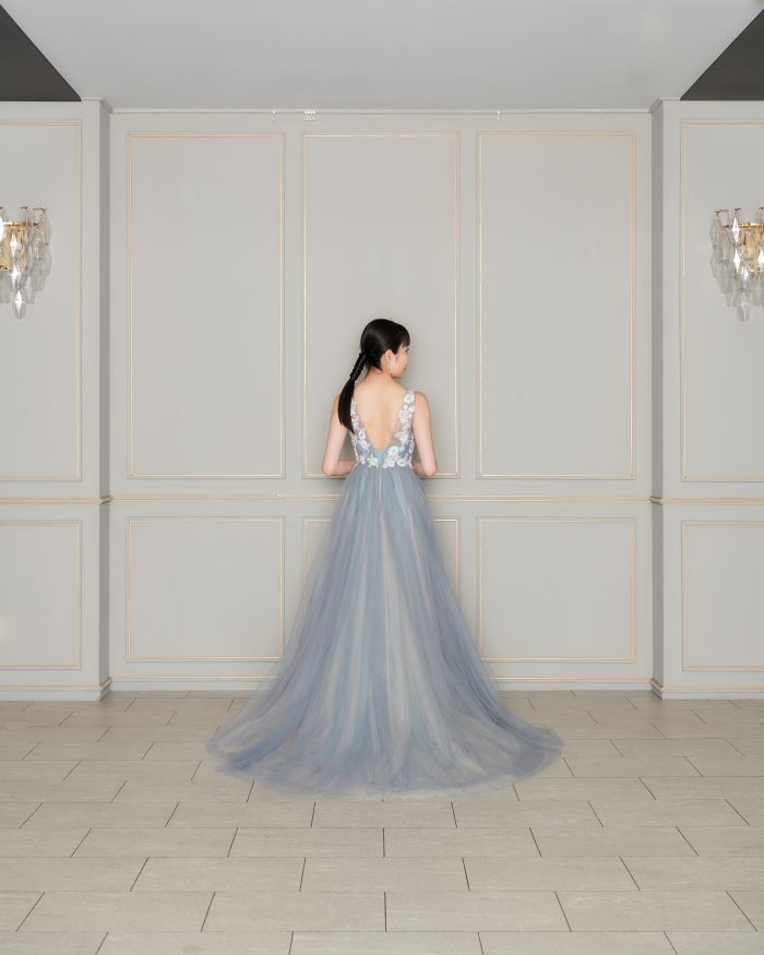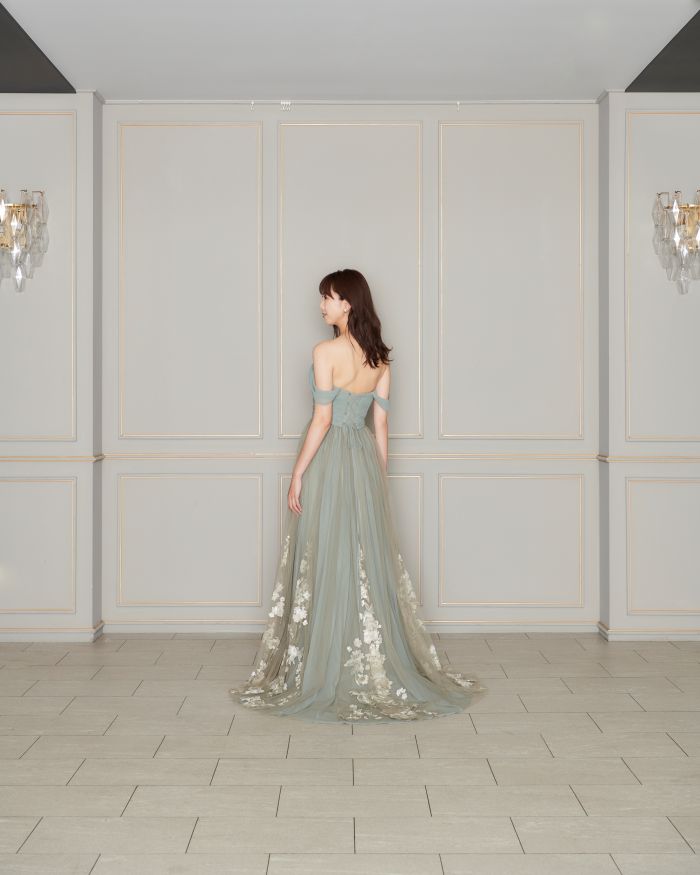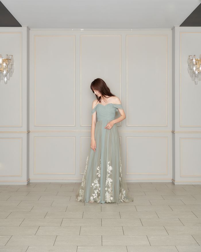 胸元のサテンとスカート部分のチュール生地の違いも楽しめる一着です。