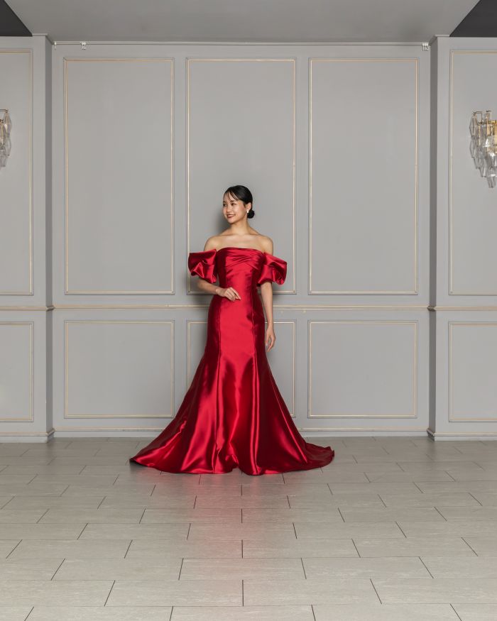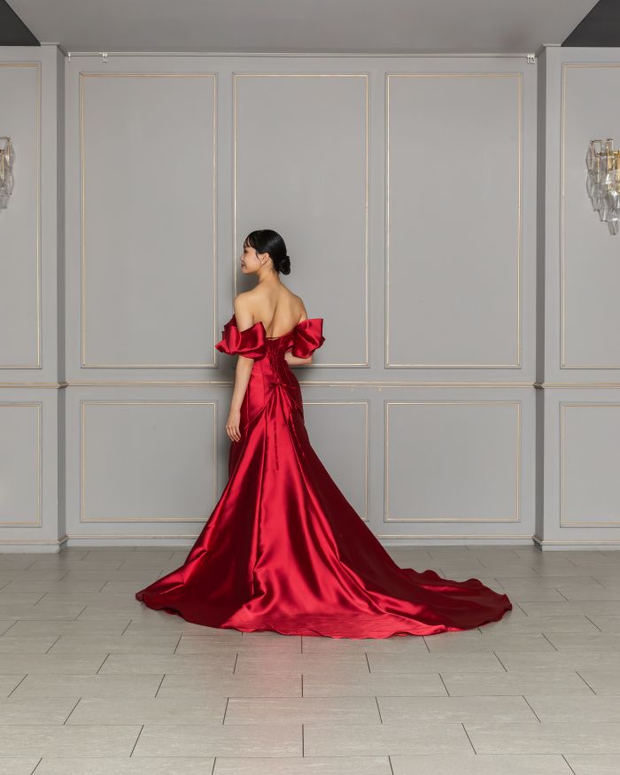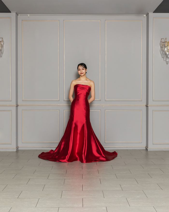 ボディラインにフィットするシルエットの美しさが魅力的なドレス。ゲストの目を惹くレッドは人気カラーです。