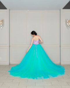 海を感じるマリンブルーのチュールが見る人の目を奪う華やかなカラードレス🐚 KIYOKO HATAらしいボリューム感も特徴的です!