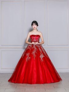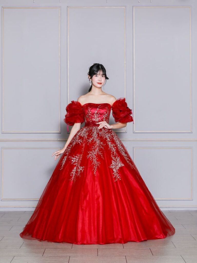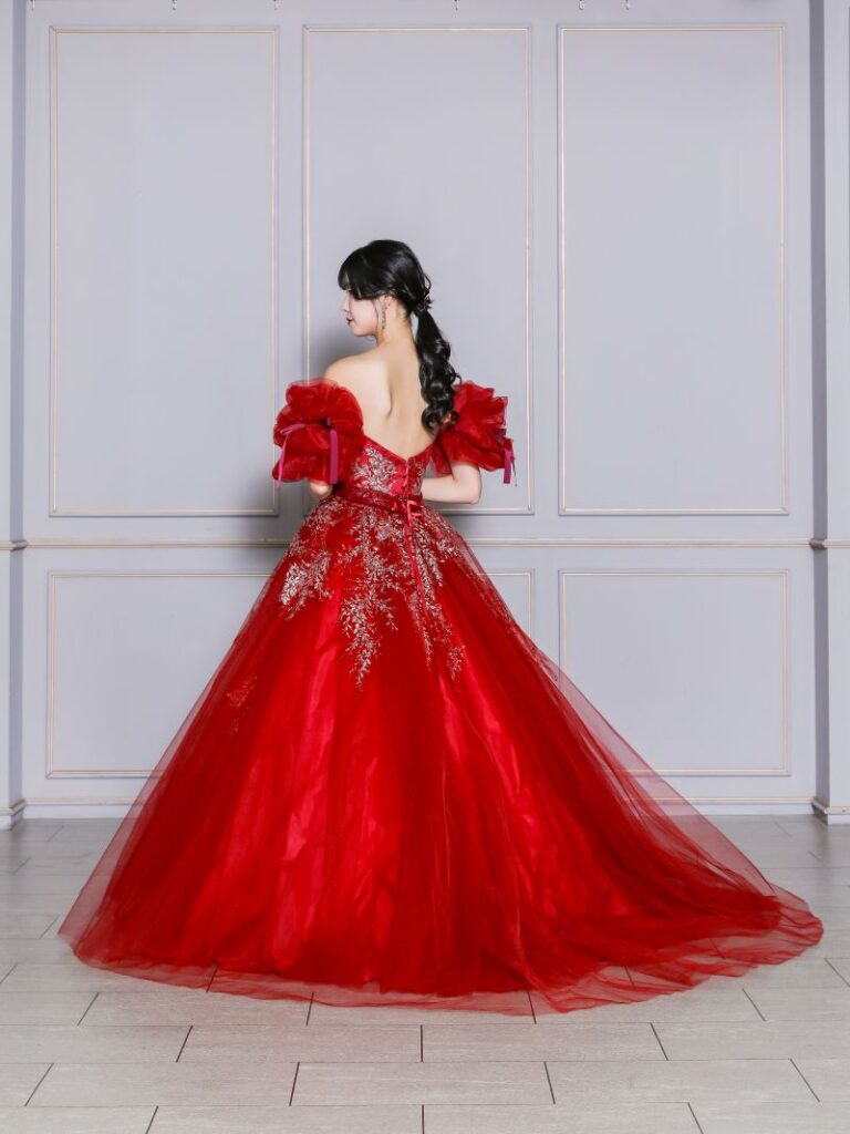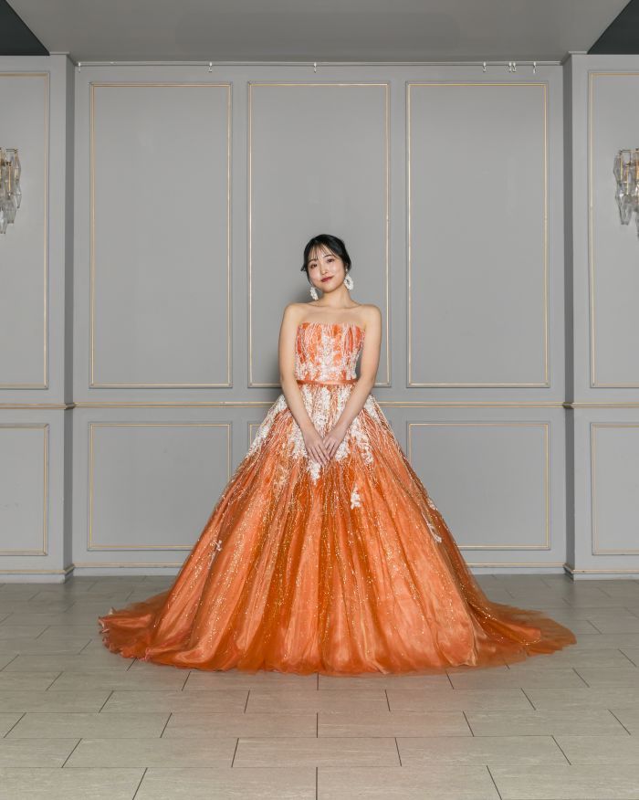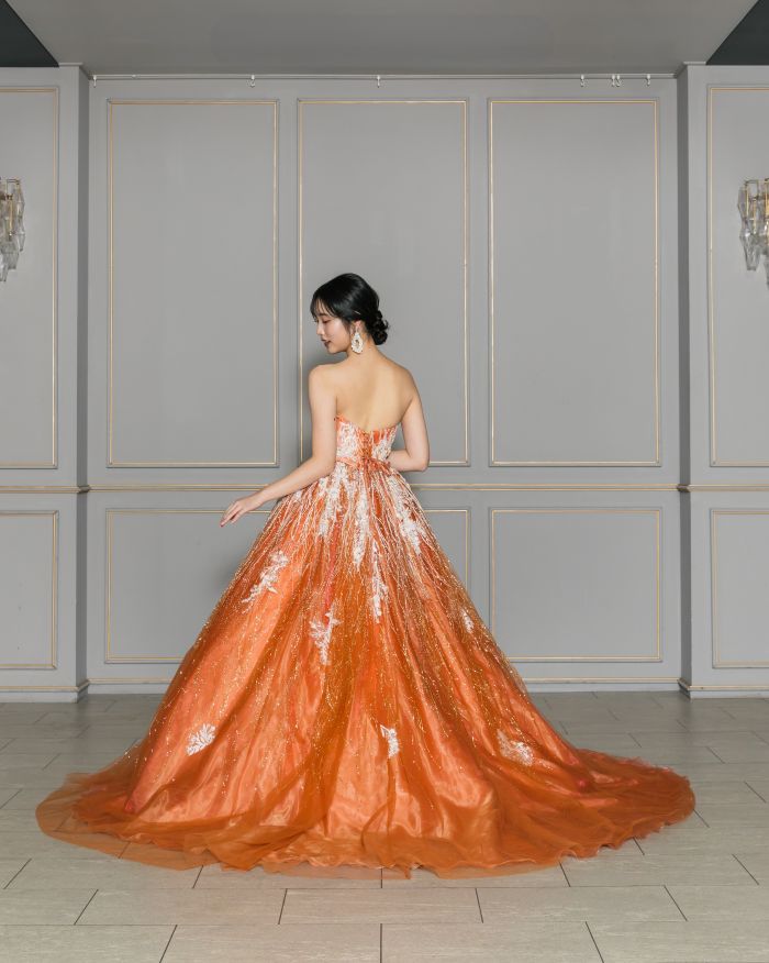繊細な刺繍とグリッターが美しく煌めく一着。気品と華やかさを備えたデザインです。取り外し可能なお袖を付けるより華やかな印象に。