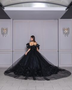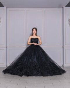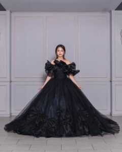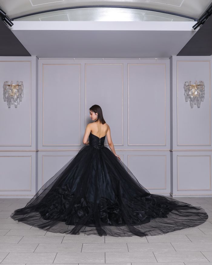 お色直しでも映えること間違いなし!なブラックドレス。ボリュームのあるスカートと袖が肩回りを華奢に見せてくれる点もポイント