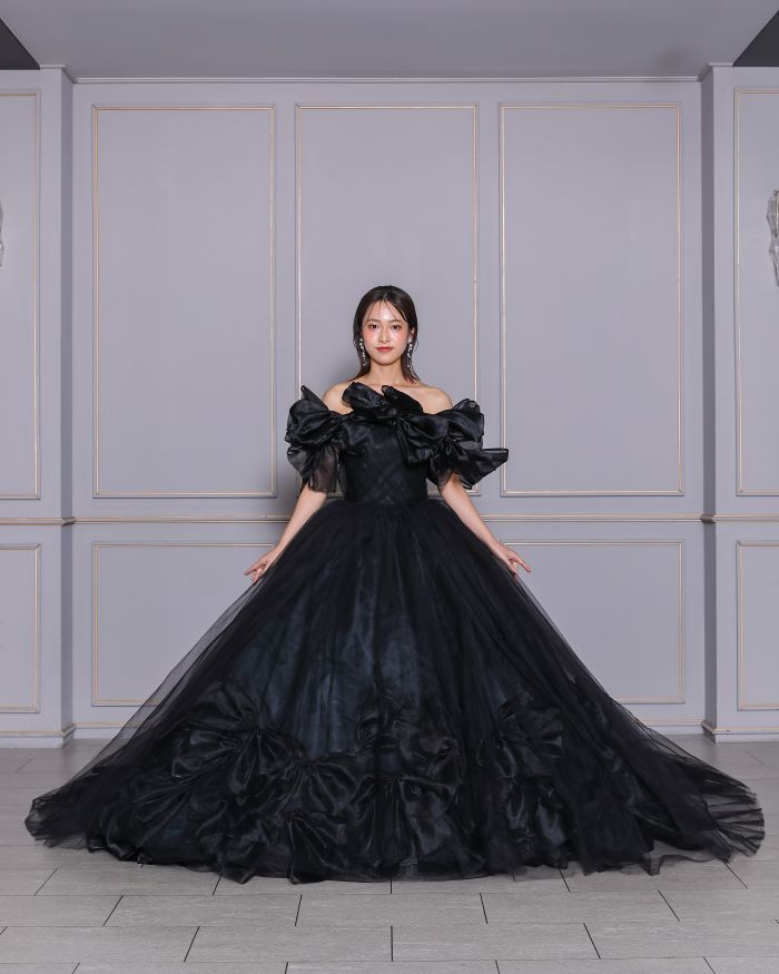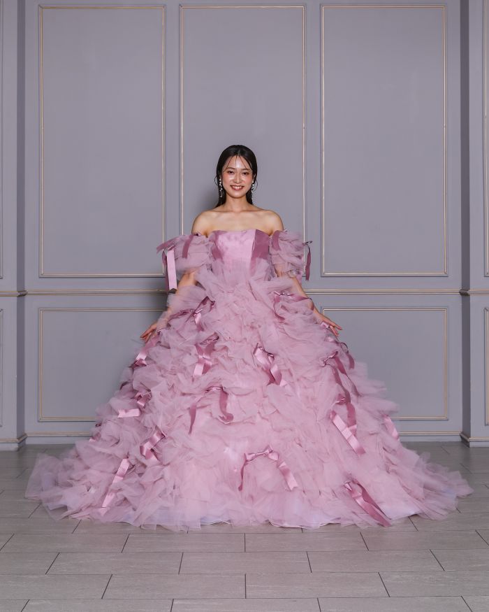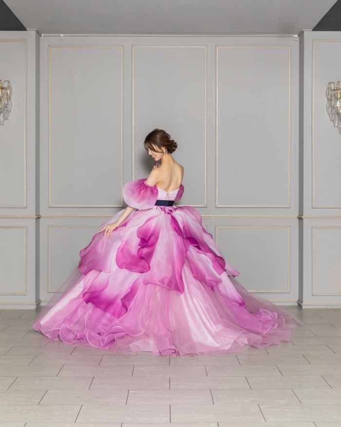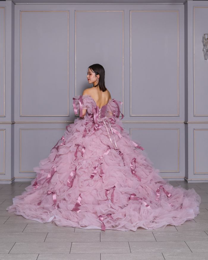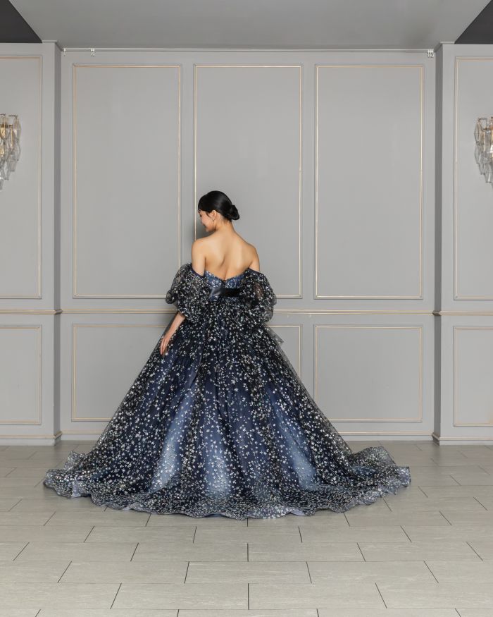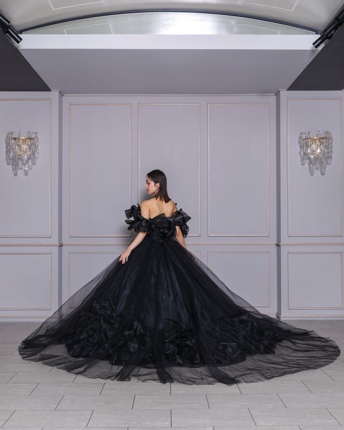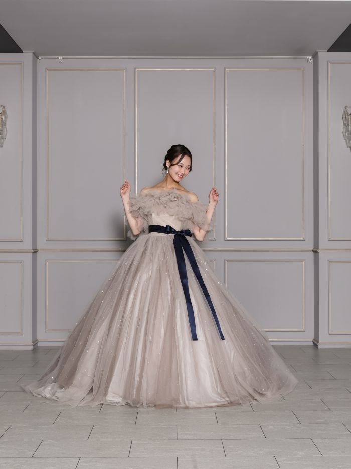 光沢のあるサテンと繊細なチュールを組み合わせたデザイン。取り外し可能なお袖は、付けるとデコルテを美しくみせてくれます。