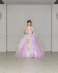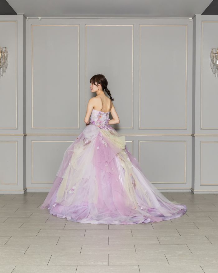 花のモチーフがドレス全体に施された淡いパープルのカラーが可愛い一着。ボリューム感たっぷりのフリルのスカートは歩くたびにピュアで可愛らしい印象を与えてくれます。