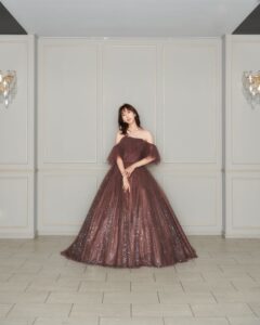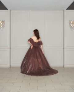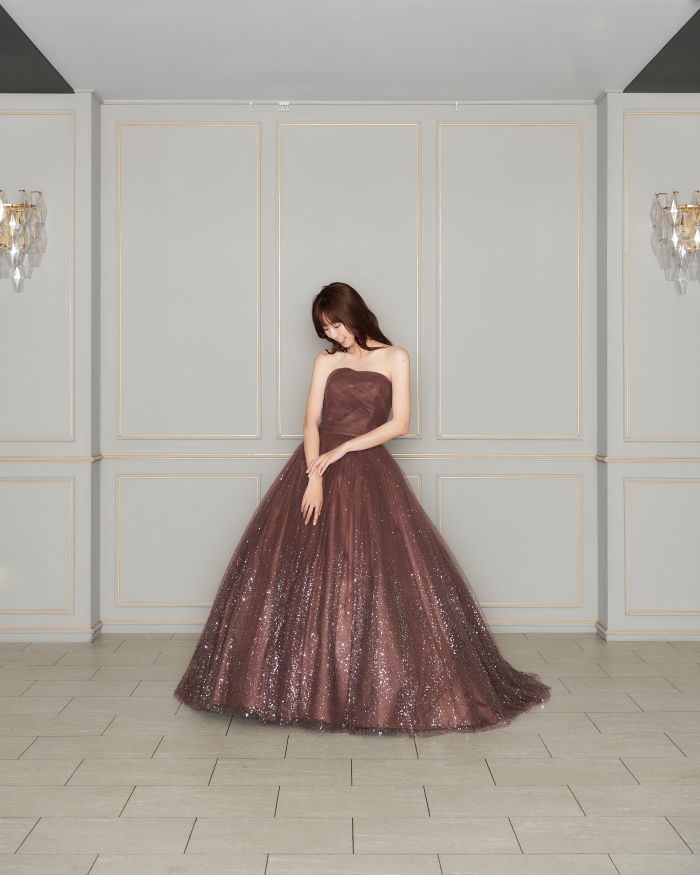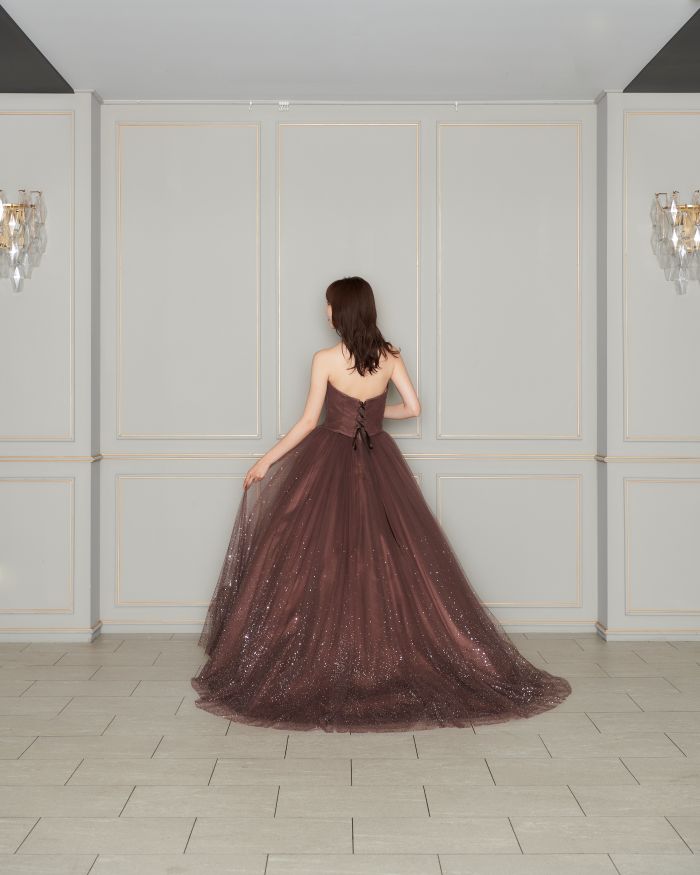 深みのあるモカブラウンのカラーに繊細になグリッターが光を受け止めてきらめき、動くたびに華やかさをプラスします。ふんわりとしたオフショルダーのチュール袖は取り外し可能で、スタイルに合わせて2Wayで楽しめます。