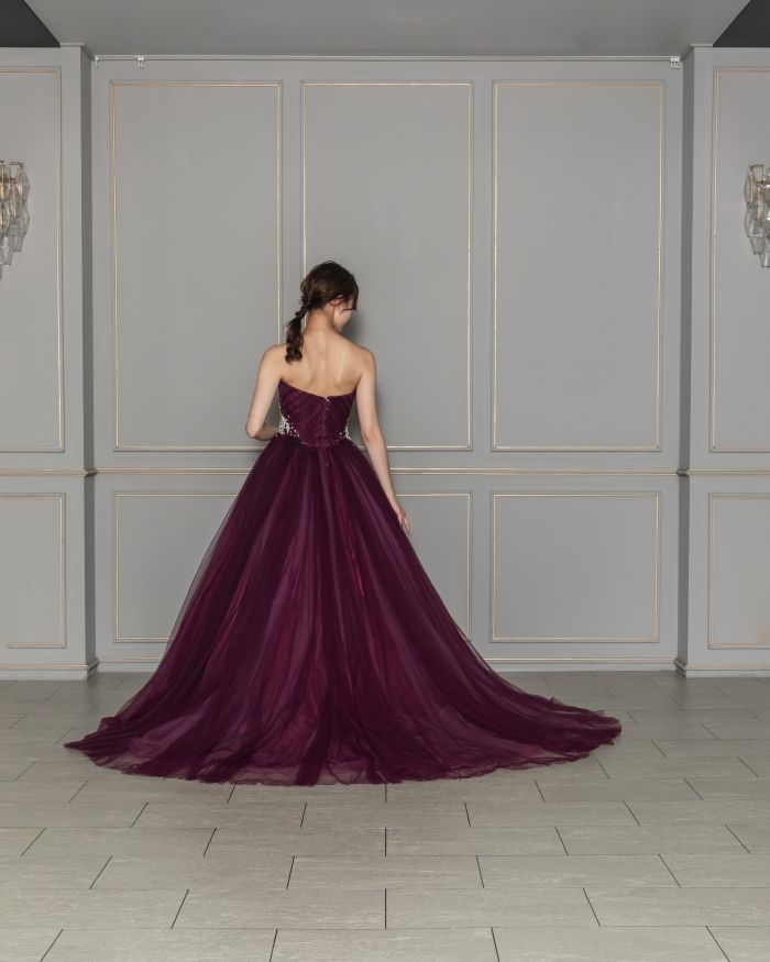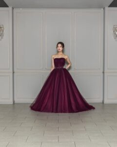 腰元のビジューのデザインがウエストを美しくみせてくれ、上品で洗練された印象を演出します。