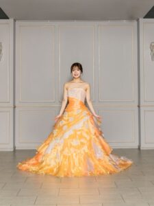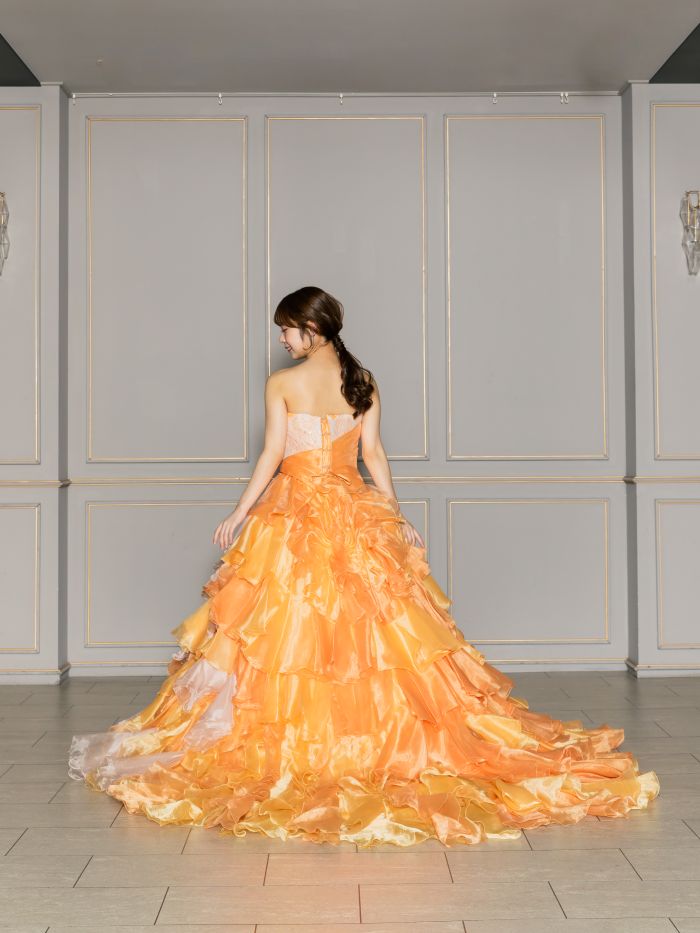 暖かみのあるオレンジカラーが会場を一瞬で明るく照らしてくれるドレス。元気で華やか印象の中にも柔らかな女性らしさを感じさせる一着です。