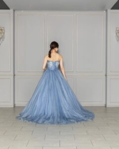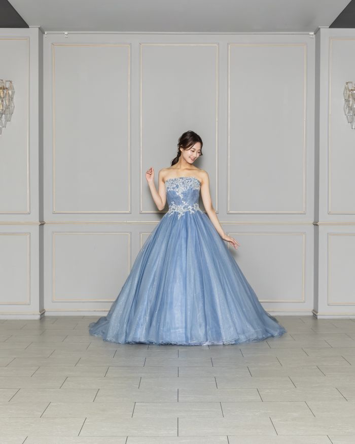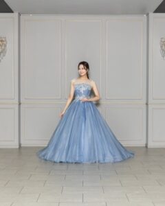 胸元のビジュー×レース刺繍が華やかな印象を与えてくれます。内側のラメが360°どこからみても可愛らしい印象に。取り外し可能なお袖を付けると透明感あふれる一着になります。