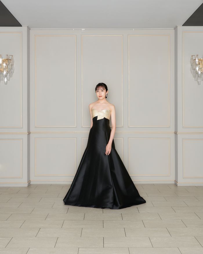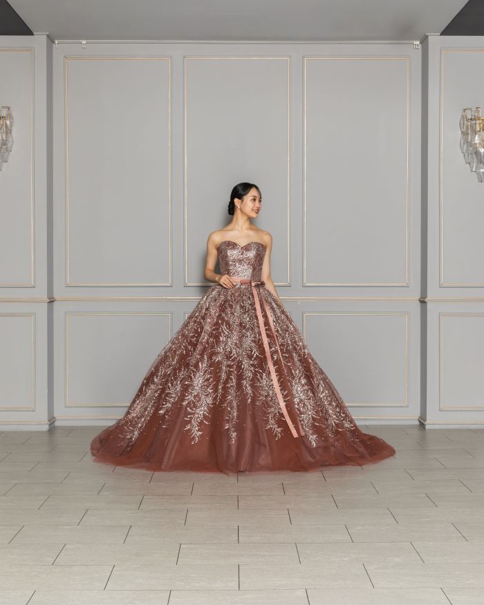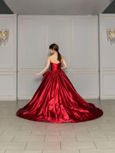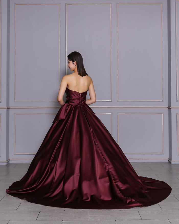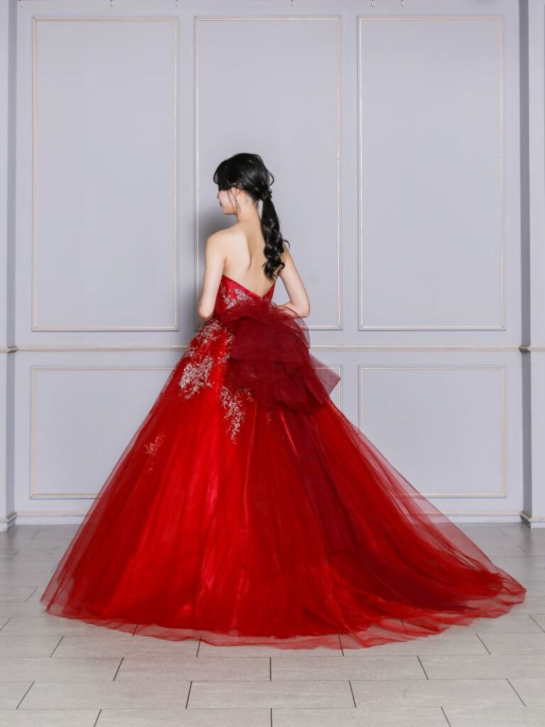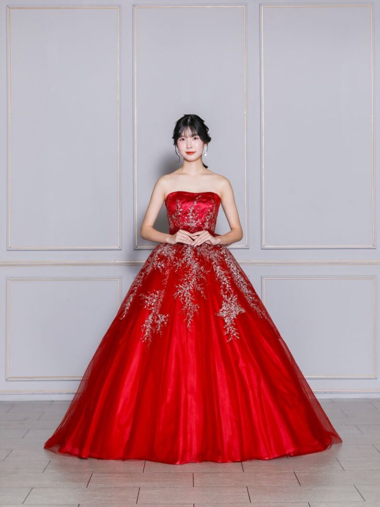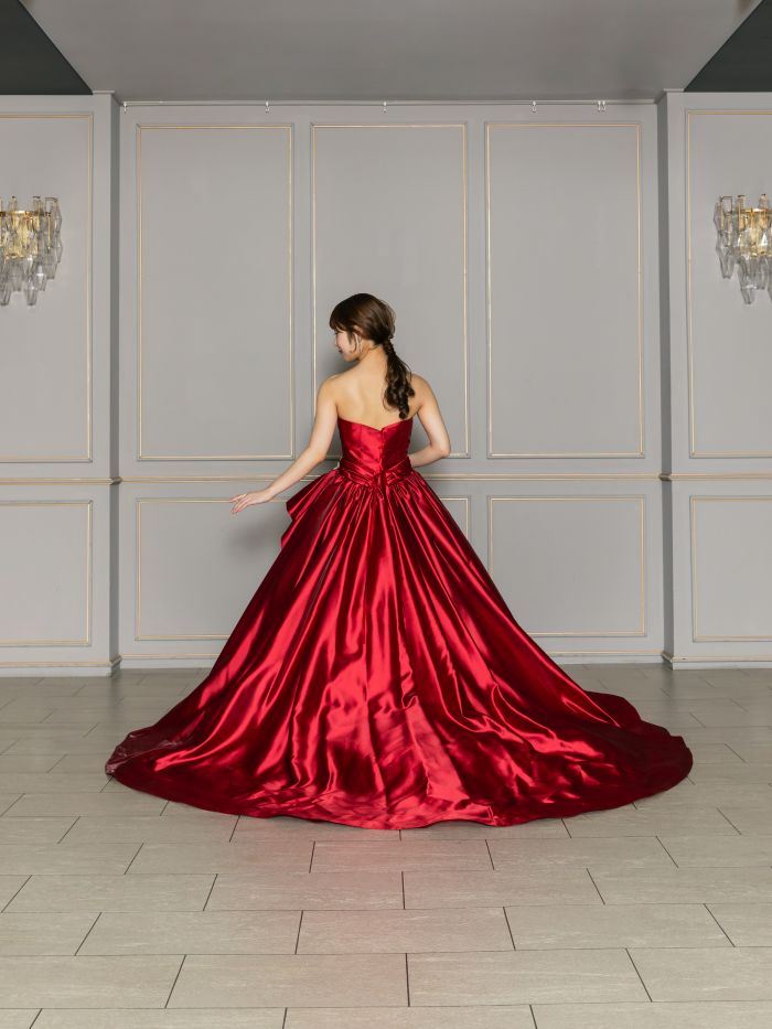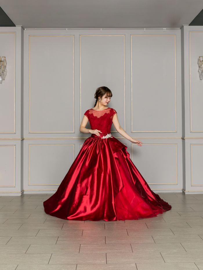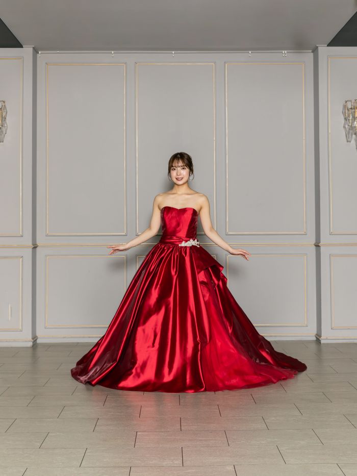 上品でエレガントな赤のサテンドレス。ウエストマークビジューが華やかさをプラスしてくれます。