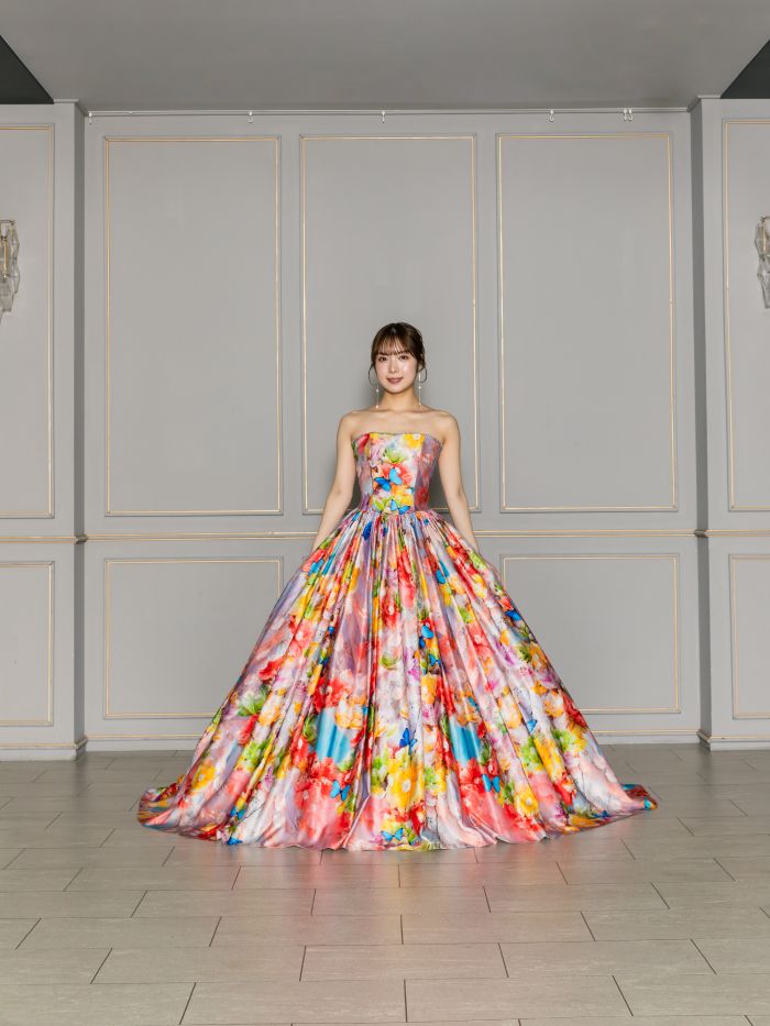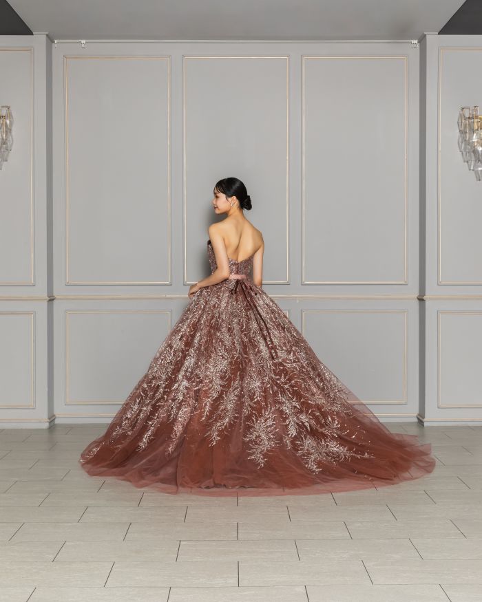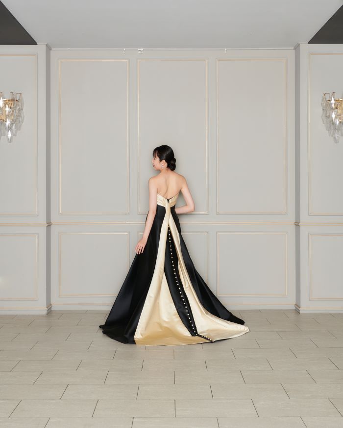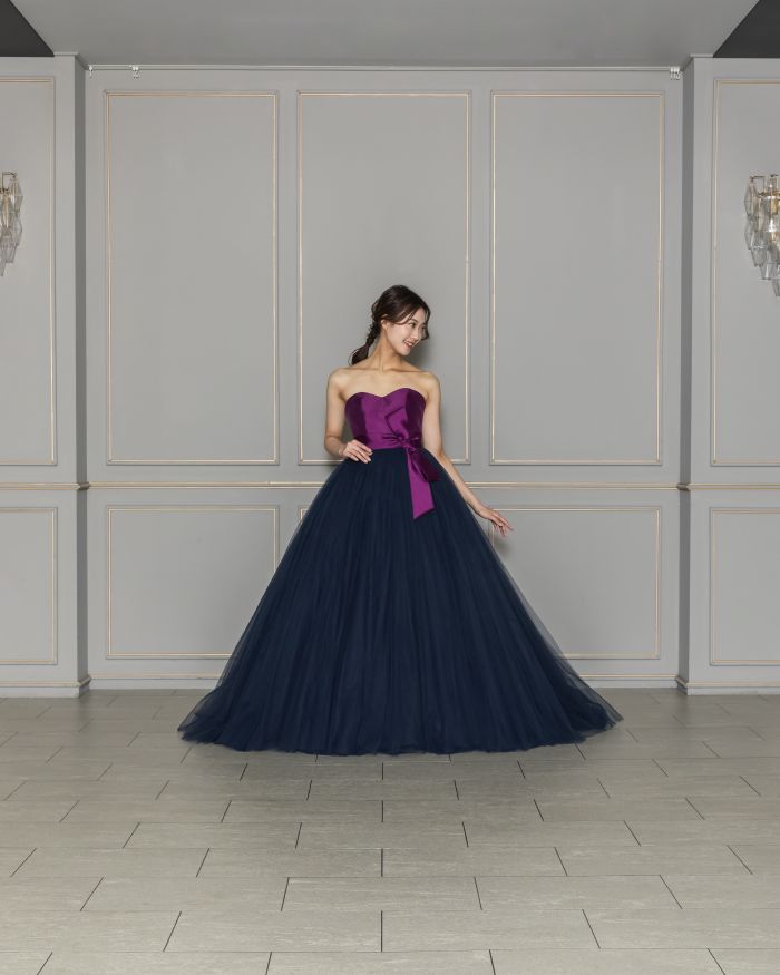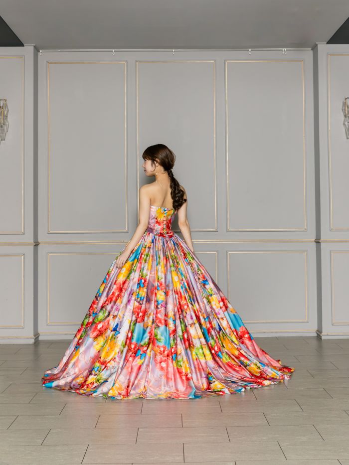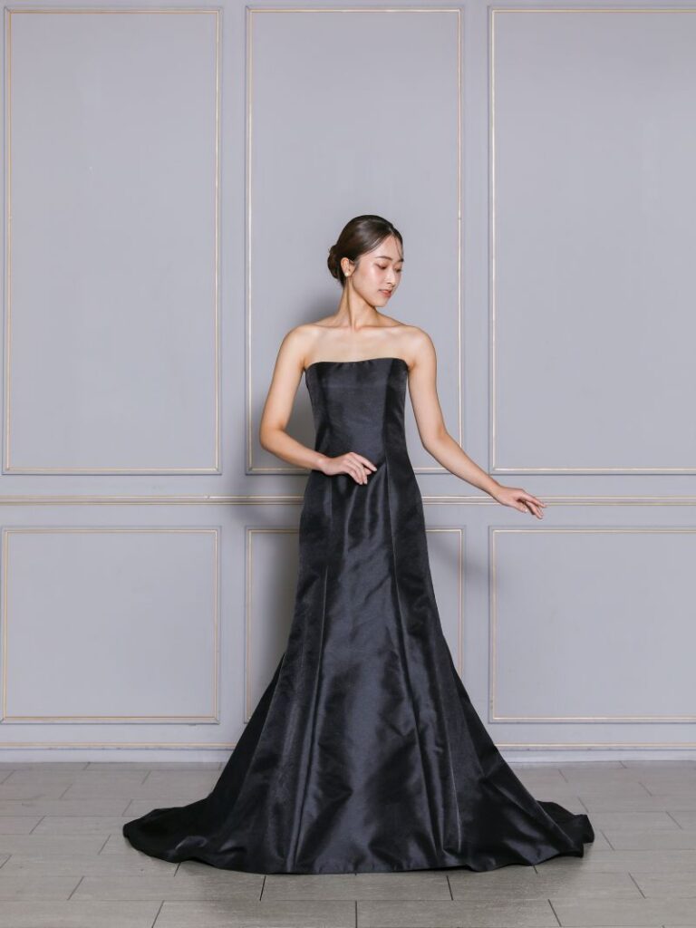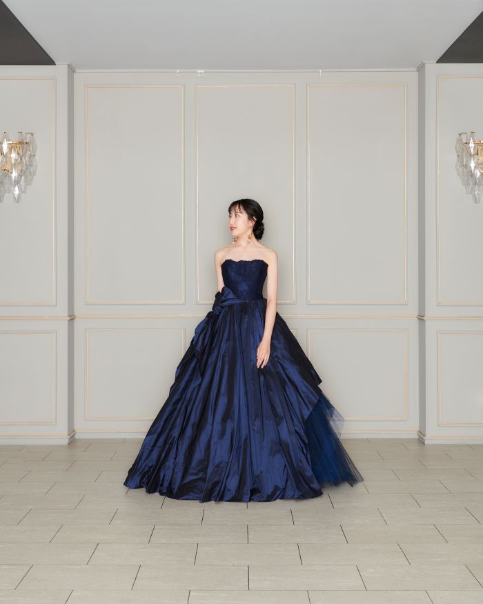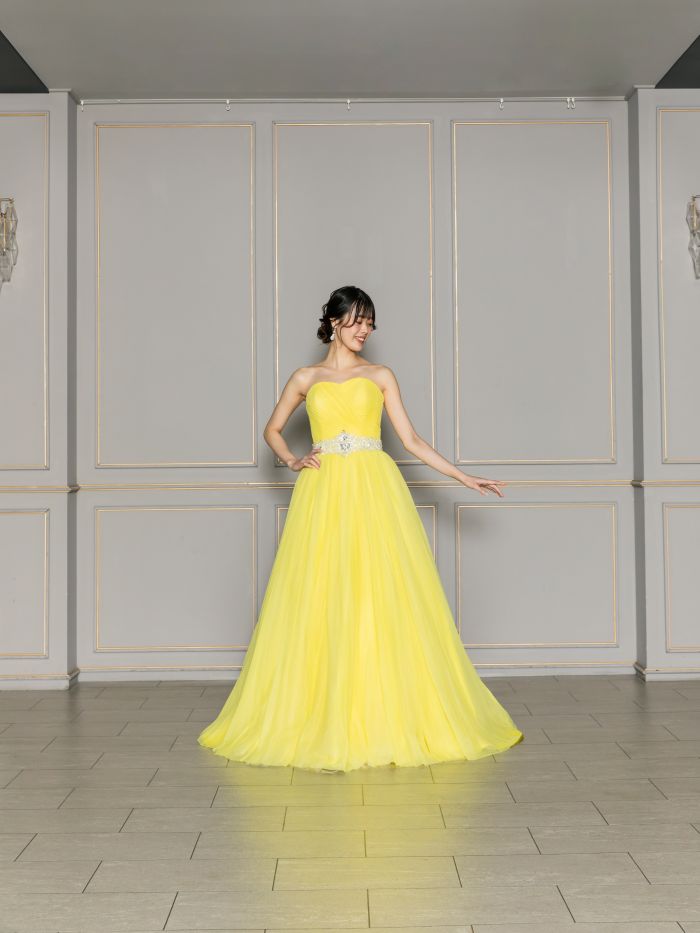 上品でエレガントな赤のサテンドレス。ウエストマークビジューが華やかさをプラスしてくれます。