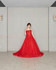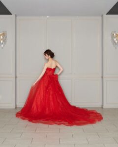 鮮やかなルビーレッドのカラードレス。繊細なチュールとグリッターのデザインはどの角度からみても美しい存在感を放ちます。バックの大きいリボンで可愛らしさも演出。