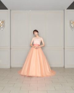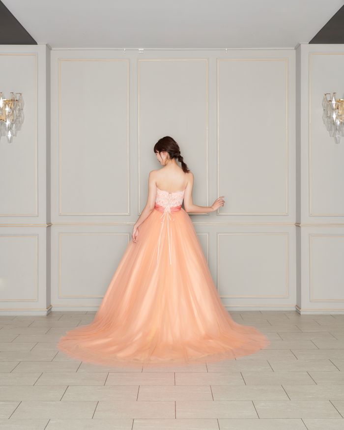 柔らかい印象のオレンジでエネルギッシュな印象を与えつつ、胸元のレースが女性らしさを感じさせます🍊
