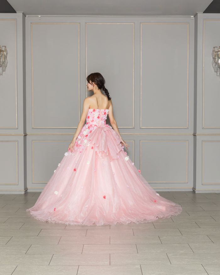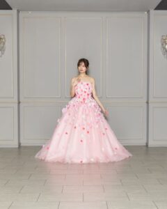 甘いピンクに贅沢にお花のコサージュが付いてとにかくキュートなカラードレス🌷 主役感たっぷりお姫様ドレスです👑