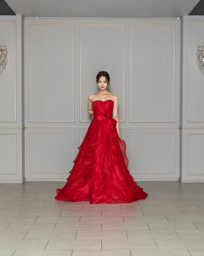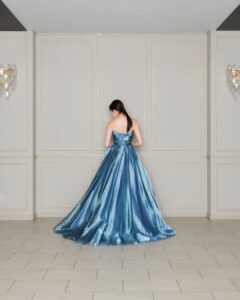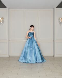 光沢のあるブルーグレーがリュクスな雰囲気を叶える1着 見る角度や光の当たり方で違った色味に見えるのもポイントです。