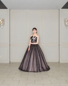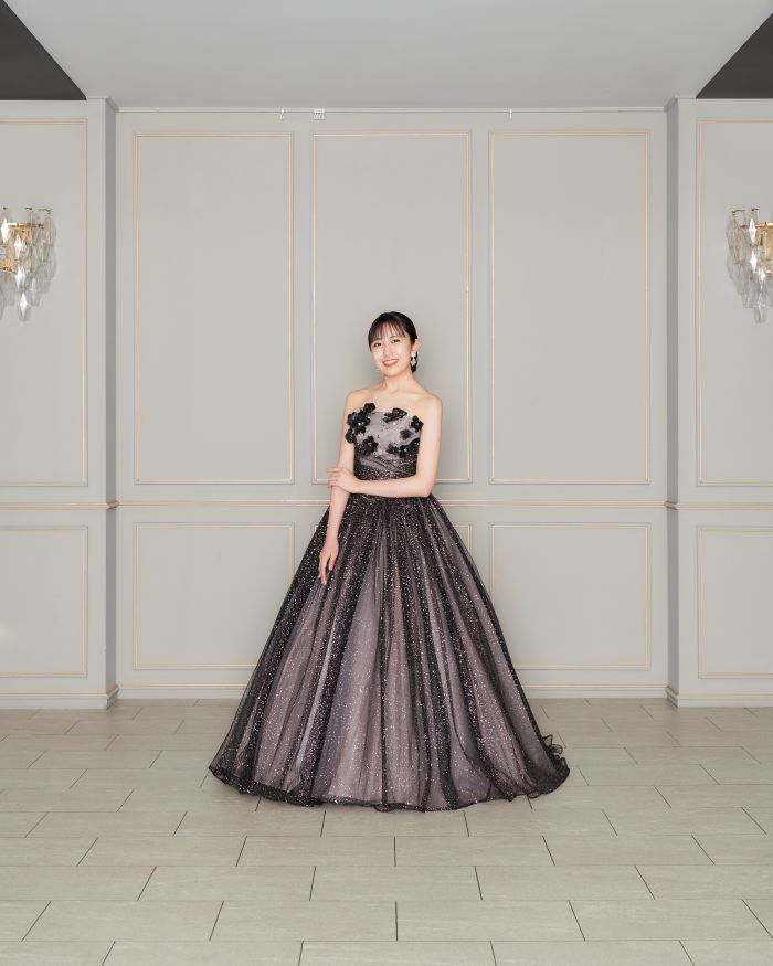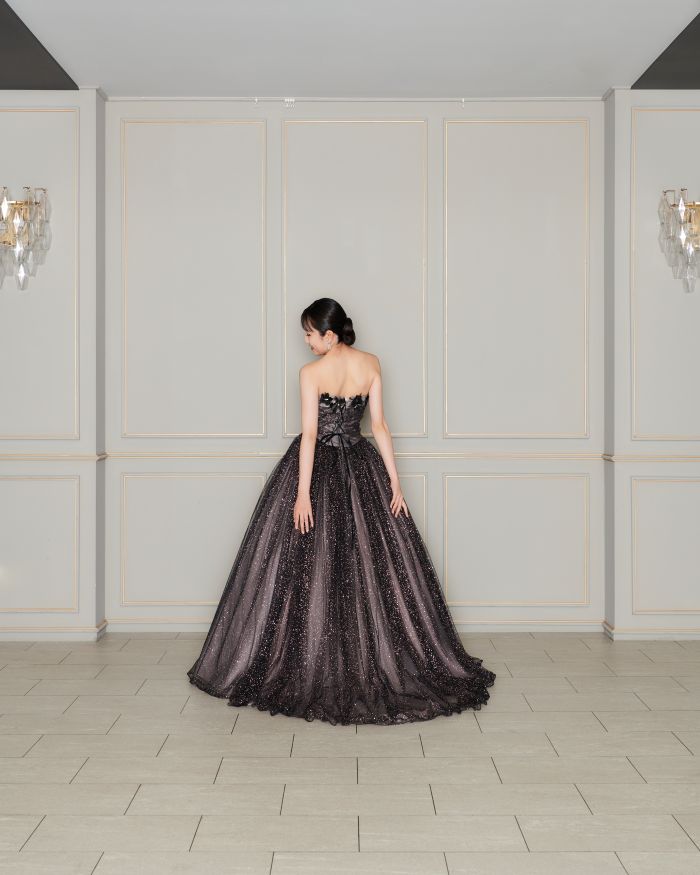 シアーなブラックは軽やかな上質さを感じます 動くたびに煌めくグリッターが視線を釘づけに。