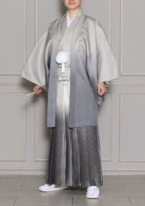 淡すぎず濃すぎない絶妙なグレーの色合いが、控えめながらも上品さを演出します。羽織と袴のグラデーションがポイントで、人と被らない一着です。