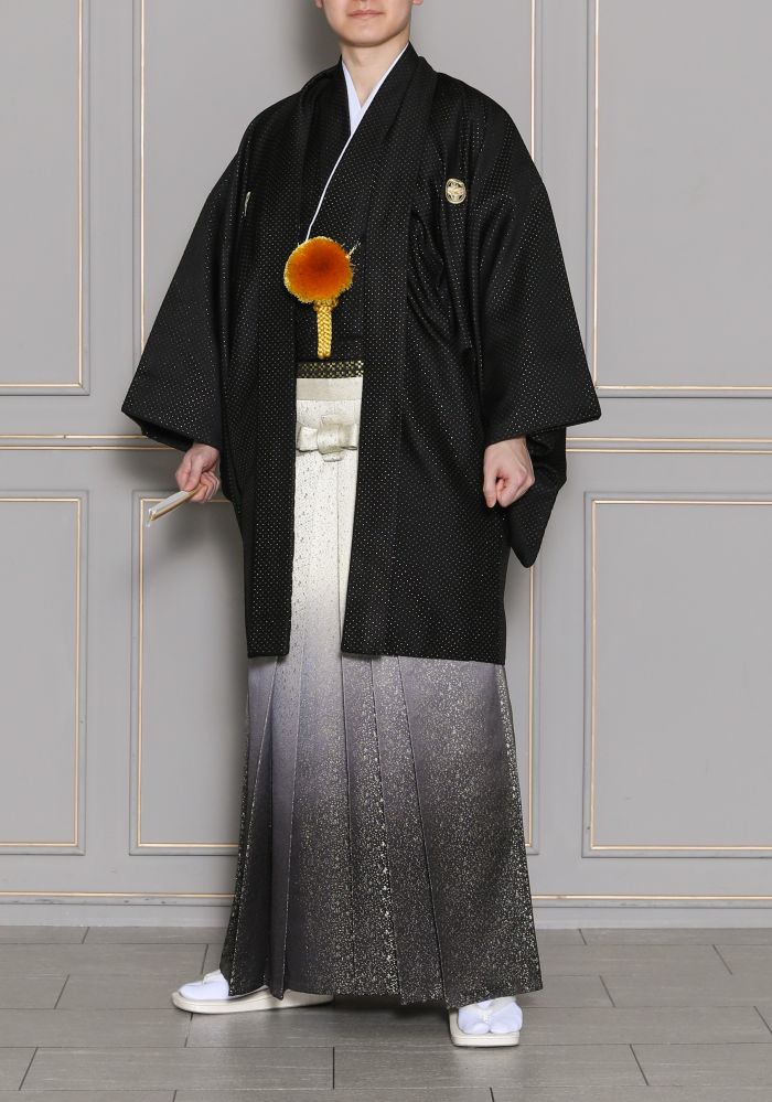 上質な生地が光を柔らかく反射し、動くたびにきらめきを放ちます。橙色の羽織紐がポイントとなり、スタイリッシュで華やかに魅せたい新郎様におすすめのデザインです。