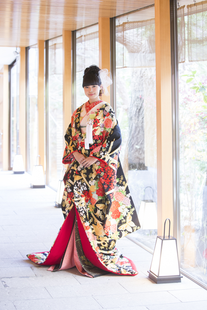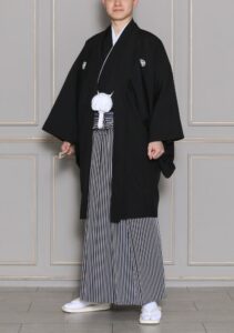 深みのある黒地に、上質な仙台平の袴を合わせた格調高いデザイン。凛とした気品と重厚感を感じさせます。