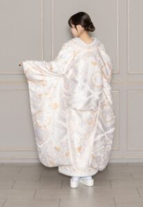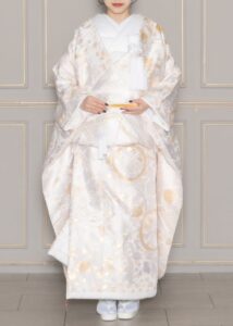 金の刺繍がゴージャスな白無垢。大柄で存在感のある印象に。