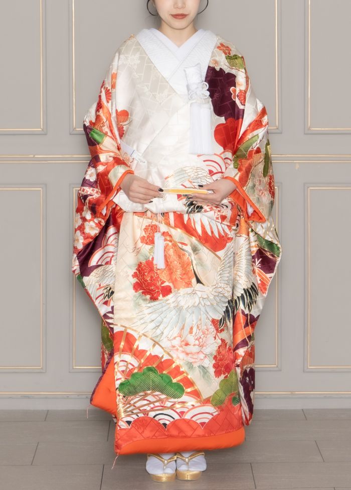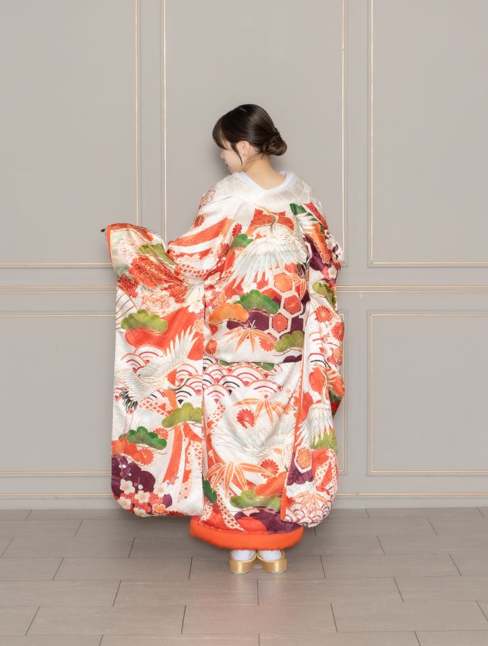 大胆な鶴と松の柄が凛とした印象の色打掛。柄を縁取るようにあしらわれた金糸がさらに華やかさをプラスします。