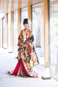 パッと目を引く黒地に繊細なお花と蝶が美しいデザインの色打掛です。