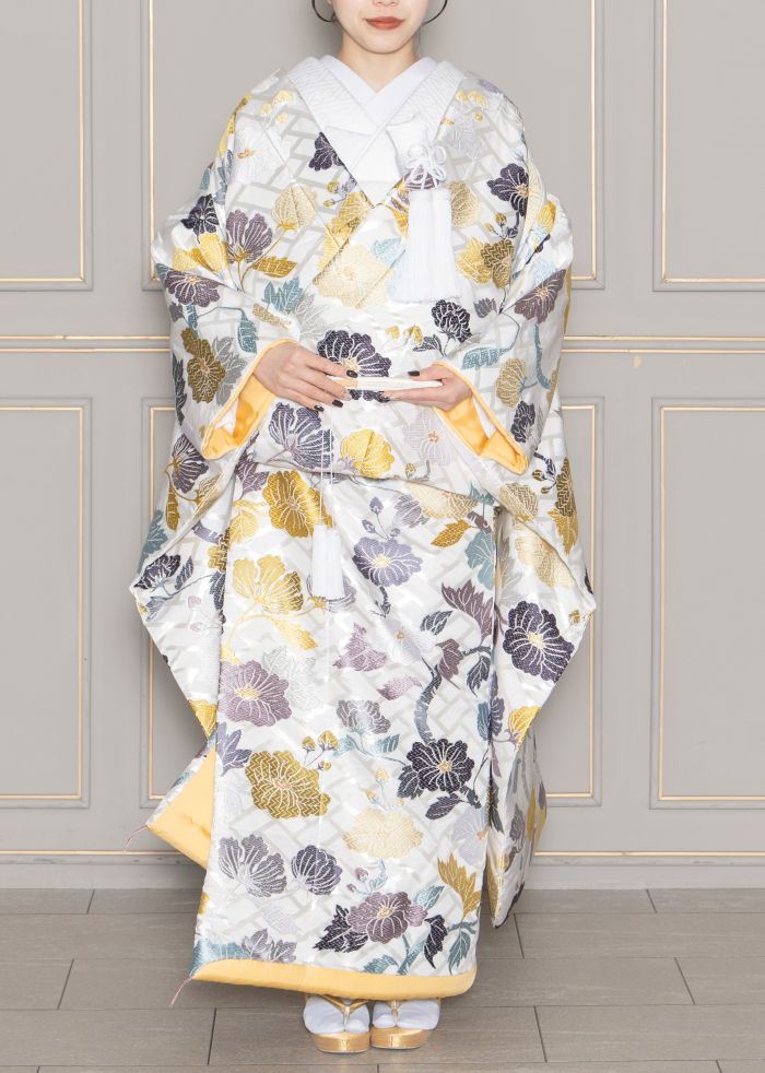 全面にちりばめられた寒色系の花刺繍が印象的な一着。爽やかですっきりとした印象に。