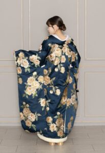 艶のあるネイビーに落ち着いたゴールドの牡丹が映える一着。艶やかで上品な印象に。