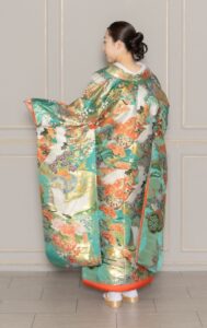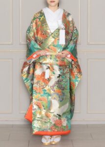 ターコイズグリーンと橙色のコントラストが映える色打掛。伝統的な鶴の刺繍がより華やかな印象を与えます。