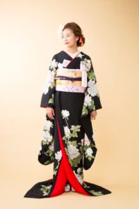 シックな黒に豪華で品格のある牡丹の花が特徴的。奥ゆかしい印象を与えます。