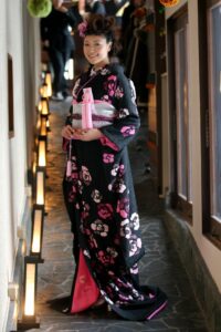 ラメ感のある黒地にピンクや紫などの洋風なバラがあしらわれる。古典的かつ華やかな和モダンスタイル。