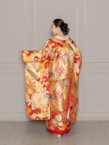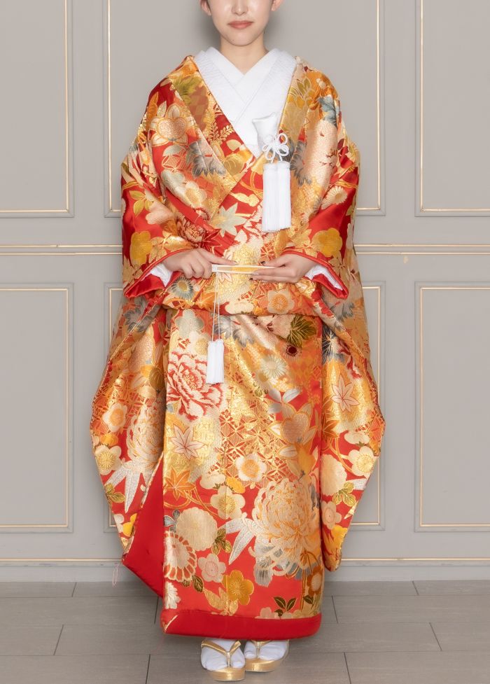 存在感のある赤地にゴールドの刺繍がよりアクセントになり華やかな印象に。四季を感じられる一着です。
