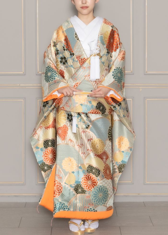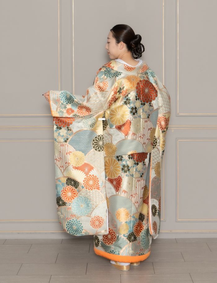 艶感のあるシルバーに柔らかさのある水色。オレンジやパールゴールドのお花。優し気で気品のある美しさを感じられます。