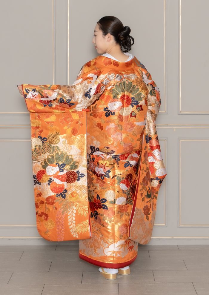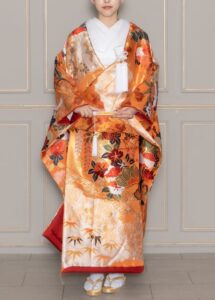 艶のある朱色が美しい、上品なデザインの色打掛。 雲や花の文様で伝統的な美しさです。
