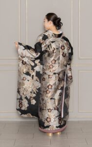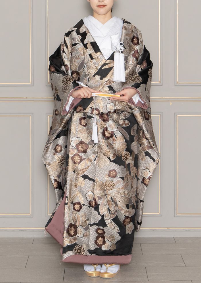 シックな黒が特徴的。ブラウンゴールドの深みのある刺繍は優雅に描かれています