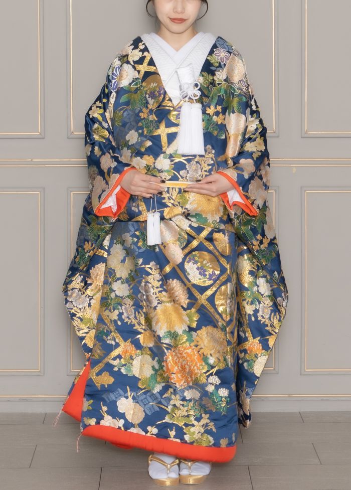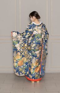 深みのある青色が神秘的な色打掛。金の刺繍でさらにゴージャスに。