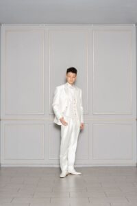 シャンパンゴールドのウェディングの王道カラー。ジャケットは長めで洗練された印象、そして格式の高さがポイント。