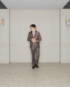 光沢感のあるブラウンはフォーマルさもありつつ柔らかい色味で着こなししやすい1着。ネクタイとベストはピンクラメを使用し結婚式という特別感をプラスしてくれる。