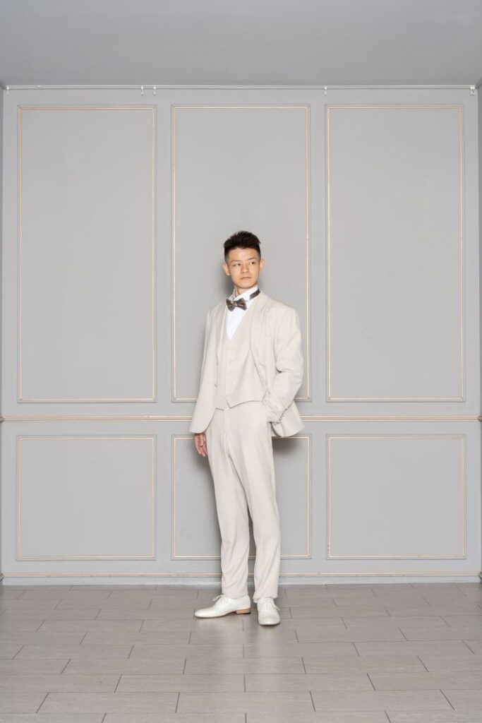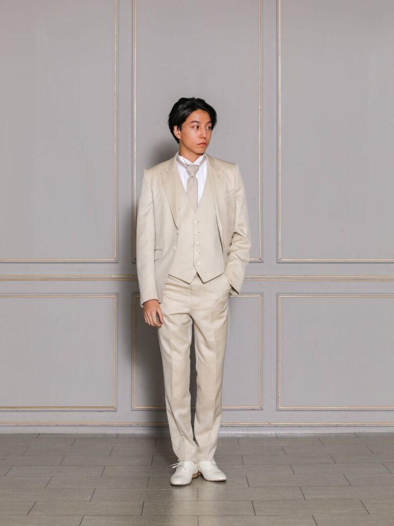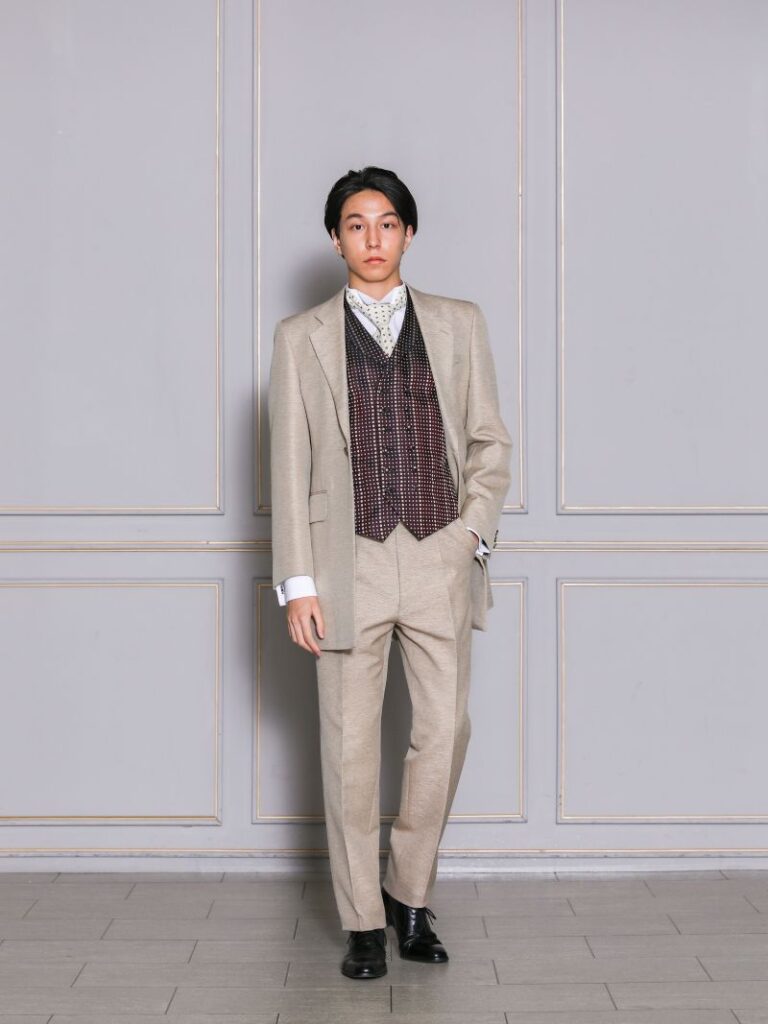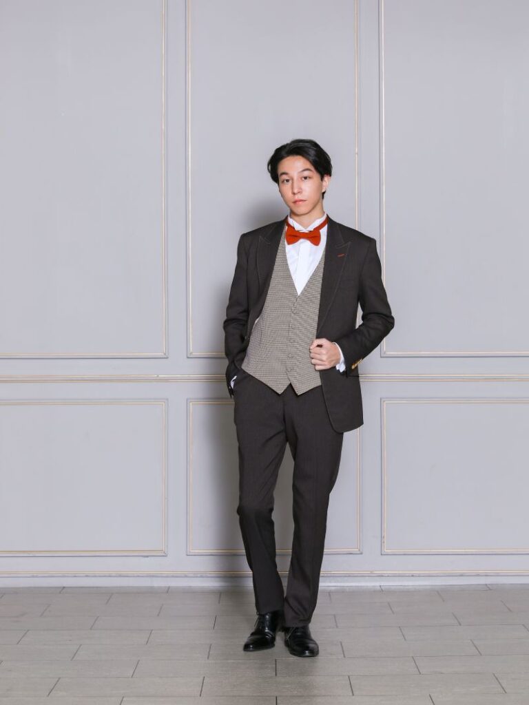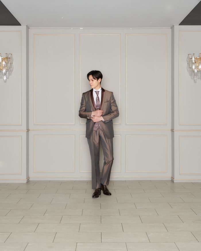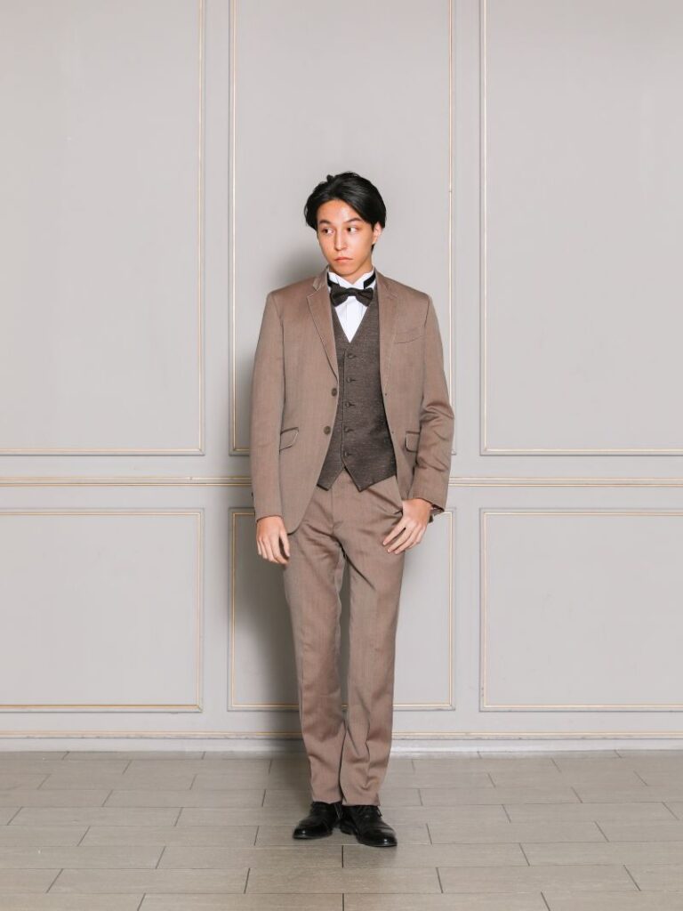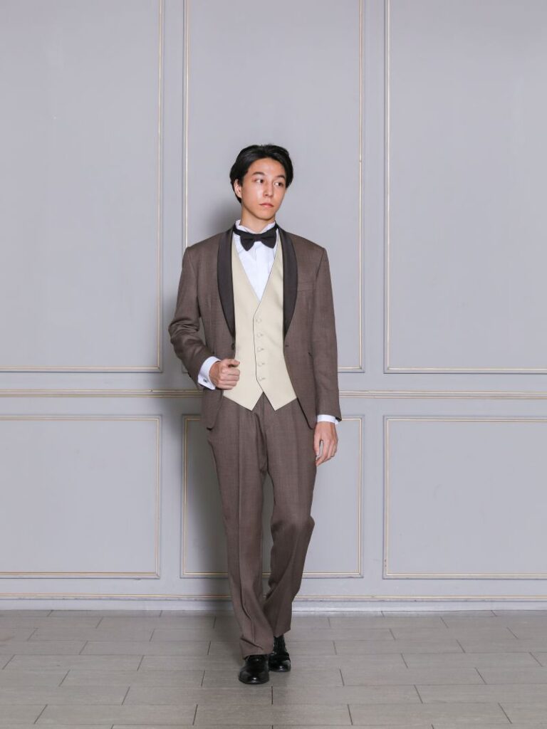 1番人気カラーの温かみのあるブラウンタキシード。ジャケットのホワイトステッチがアクセントとなって華やかな印象に。