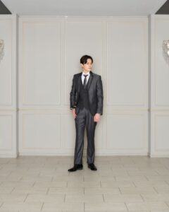 グレーカラーのタキシードは落ち着きと洗練された雰囲気を演出してくれる。光の当たり方で見え方が変わってくるので写真映え間違いなし!