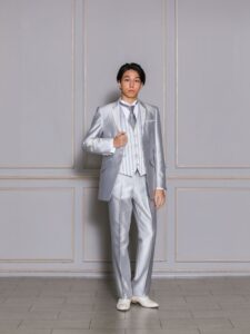 シルバー寄りのグレーカラー。寒色系の色味で落ち着きと洗練された印象に。ベストは同色系でスライプ模様が入ることでスタイルアップに。