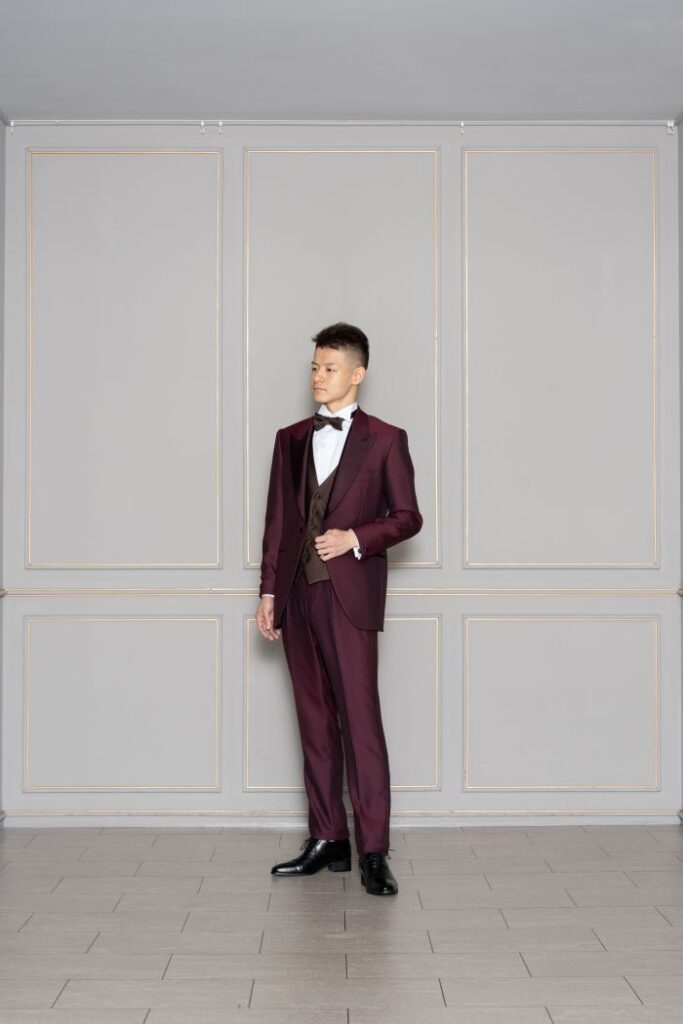 ワインレッドカラーのタキシードは落ち着きと大人の品格を演出。ダークブラウンのベスト・蝶ネクタイがワインレッドの色味をより際立たせてくれる。