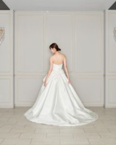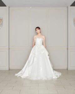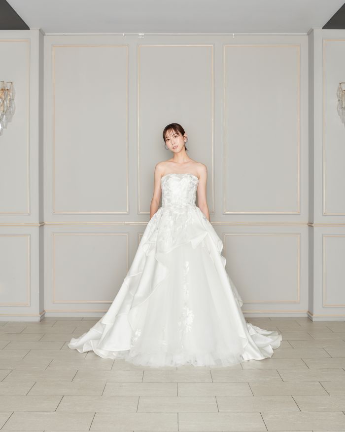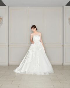 リーフ柄の刺繍と、ウエストのリボンがアクセントのデザイン。純白のチュールがふんわりと動くと、より一層上品さが際立ちます。